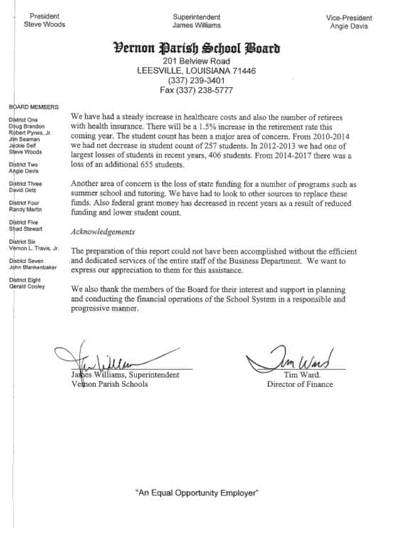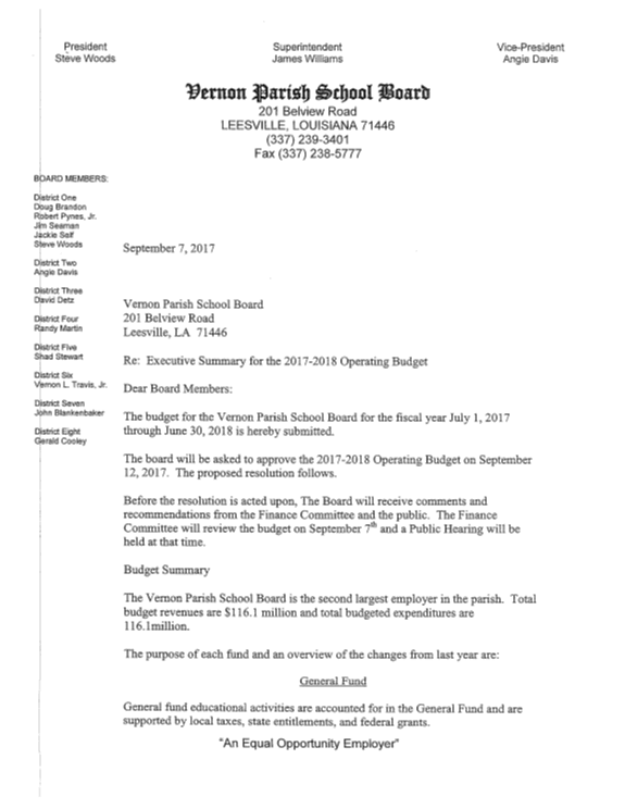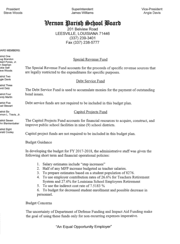 A resolution adopting, finalizing, and implementing the General Fund, Special Revenue, and Consolidated Fund Budgets of the Vernon Parish School Board for the fiscal year beginning July 1, 2017 and ending June 30, 2018, which was accompanied by this budget adoption resolution; and