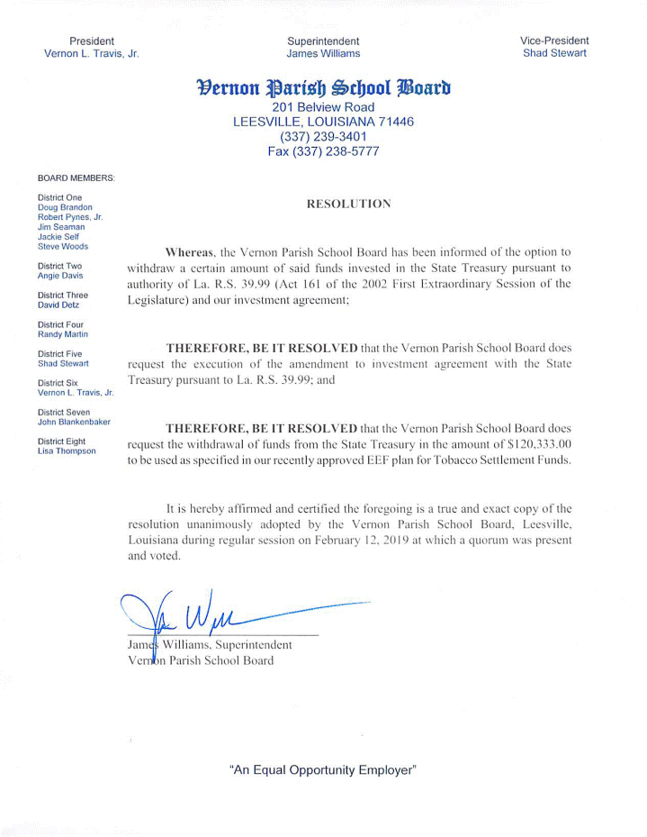 On motion of Jackie Self, seconded by Doug Brandon, the Board voted to adopt a resolution that the Vernon Parish School Board does request the withdrawal of funds from the State Treasury to be used as specified in our recently approved EEF Plan for Tobacco Settlement Funds.