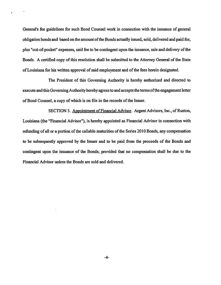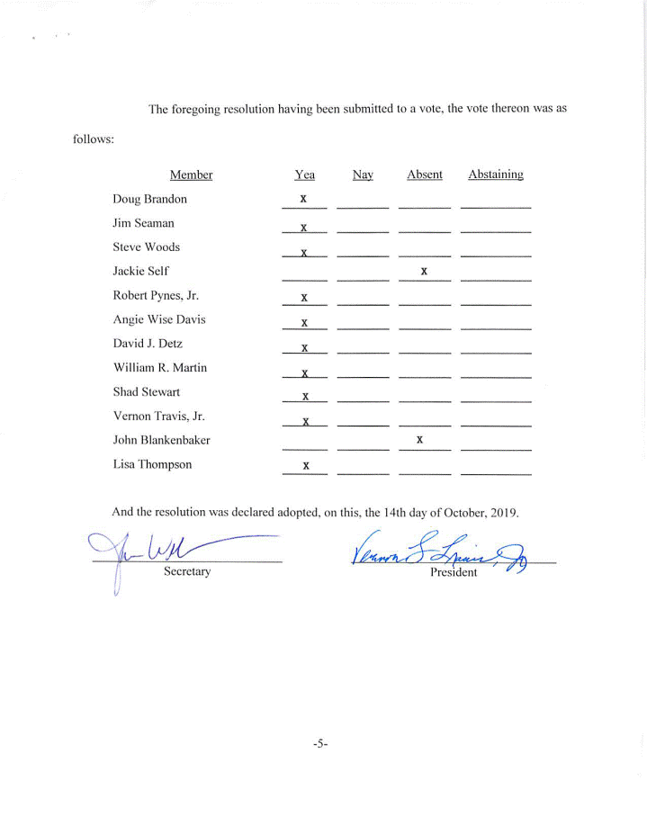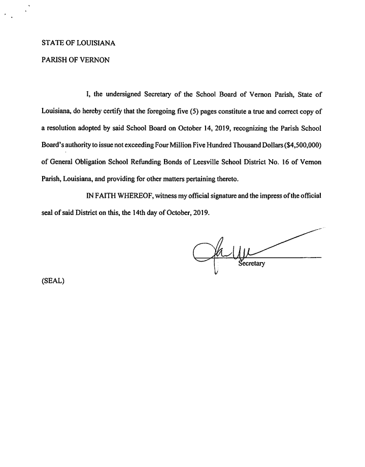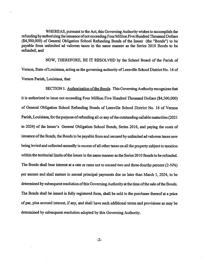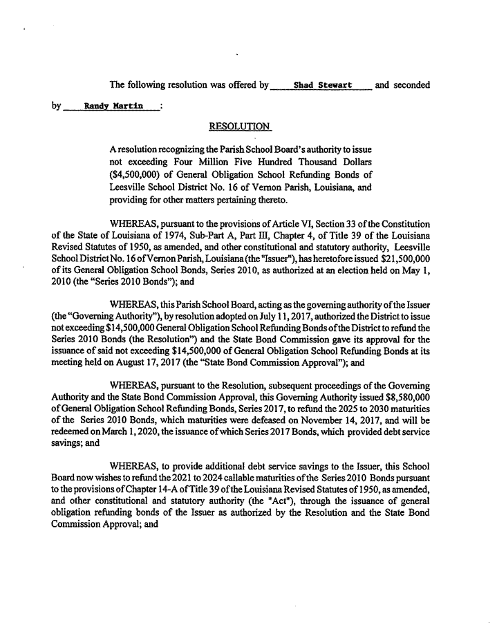 On motion of Shad Stewart, seconded by Randy Martin, the Board voted to approve a resolution recognizing the Vernon Parish School Board’s authority to issue not exceeding Four Million Five Hundred Thousand Dollars ($4,500,000) of Obligation School Refunding Bonds of Leesville School District No. 16 of Vernon Parish, Louisiana, and providing for other matters pertaining thereto.