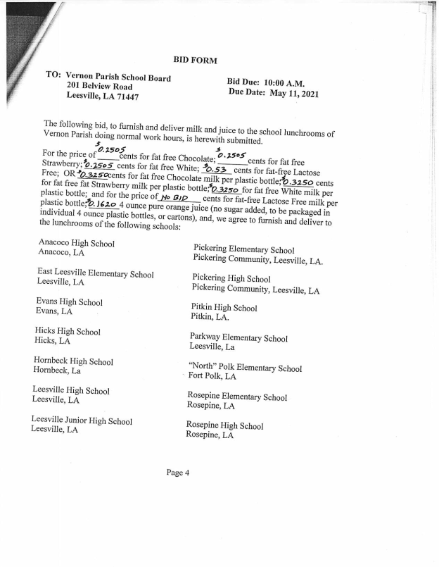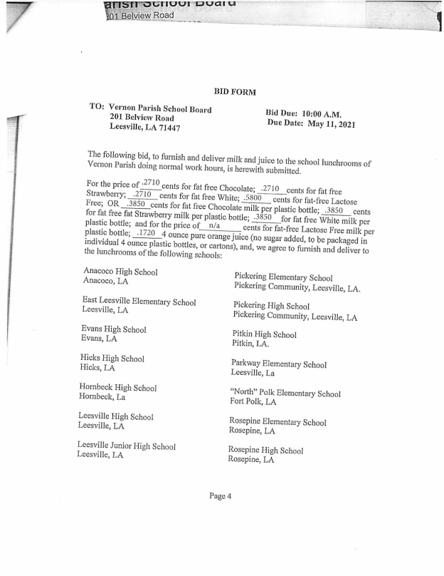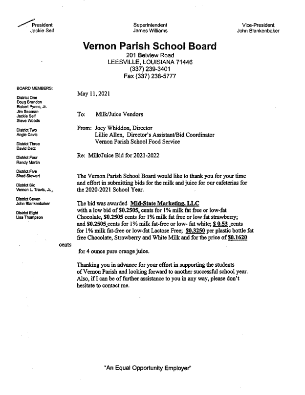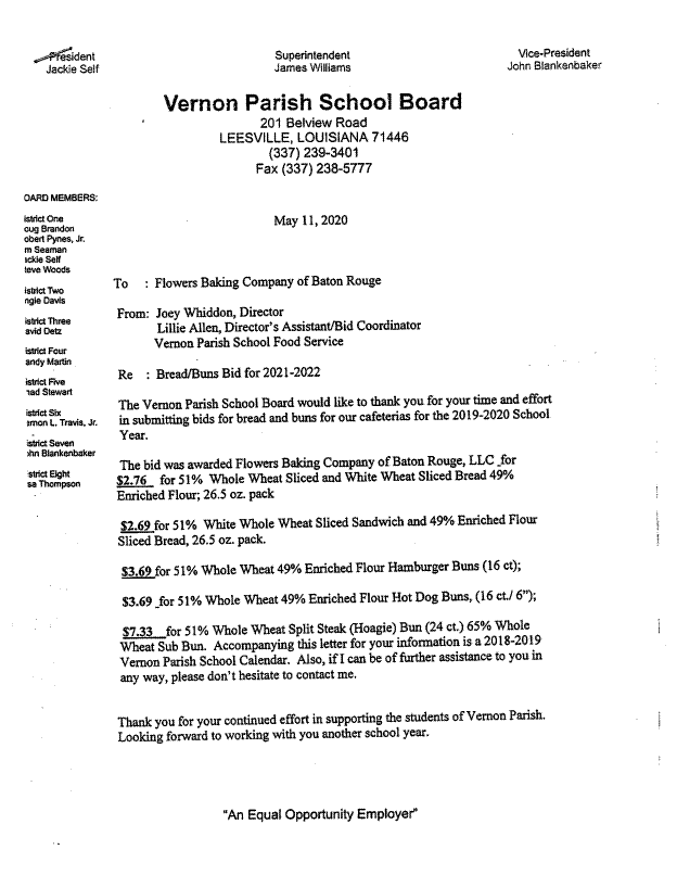 On motion of Vernon L. Travis, Jr., seconded by David Detz, the Board voted to accept the bids from Flowers for bread and Borden’s for milk and juice. Bids attached to minutes.