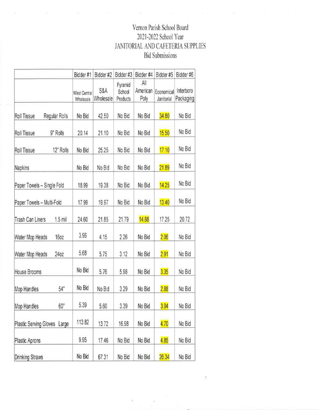 Director of Finance, Tim Ward also presented the Board with the bids from six vendors for janitorial and cafeteria supplies. Bid attached to minutes.
