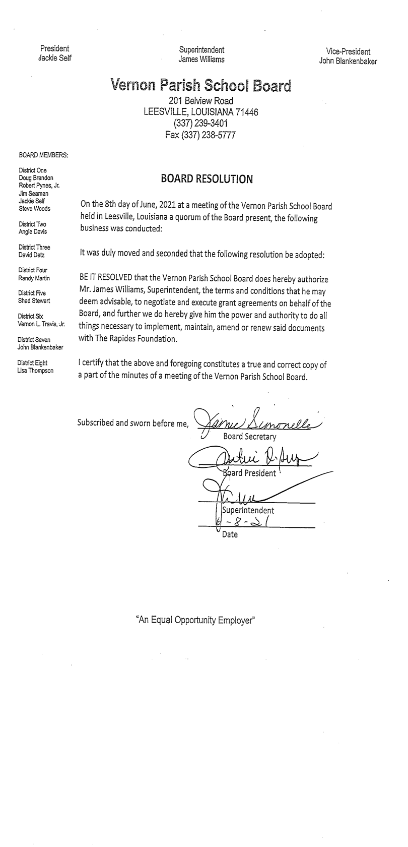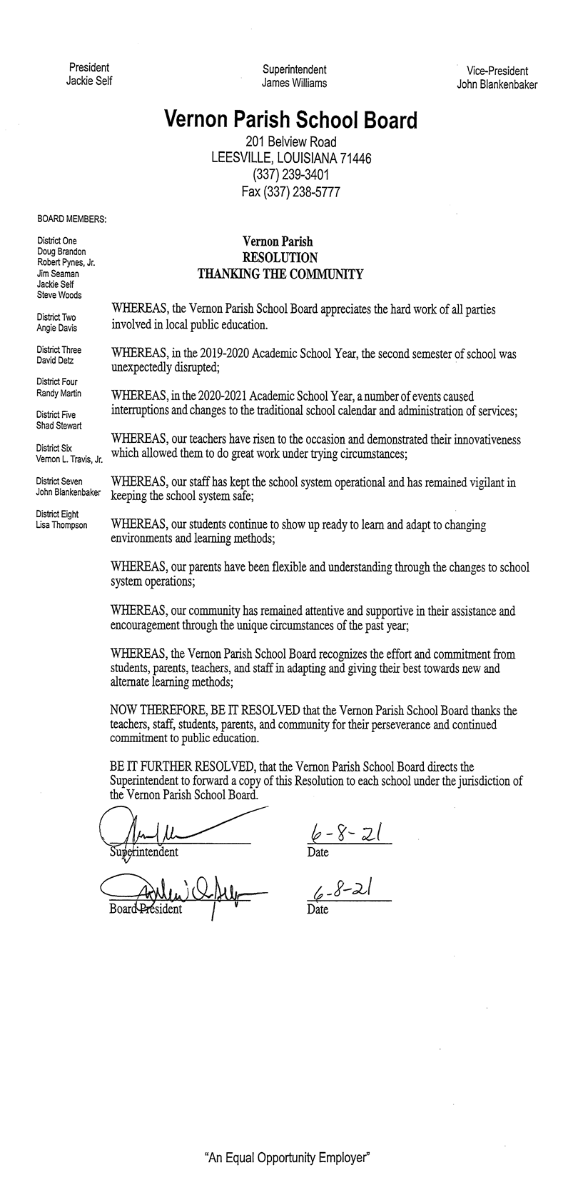 WHEREAS, the Board would like to acknowledge family members employed by the Vernon Parish School System: Ms. LaFleur’s daughter-in-law is Roxanna Harvey, Special Education Paraprofessional at Evans High School; and