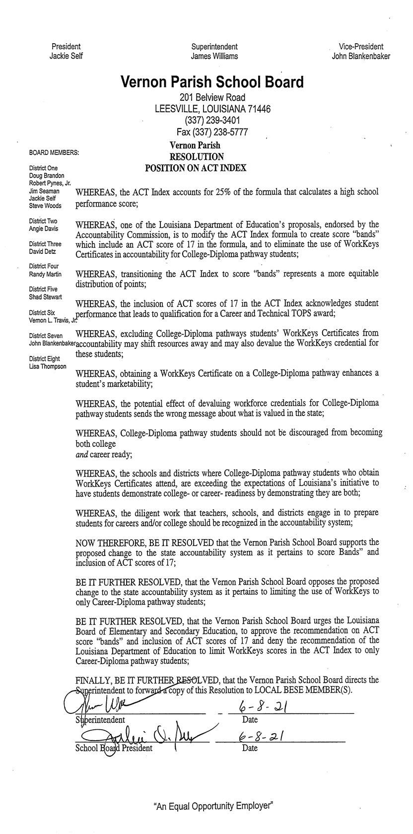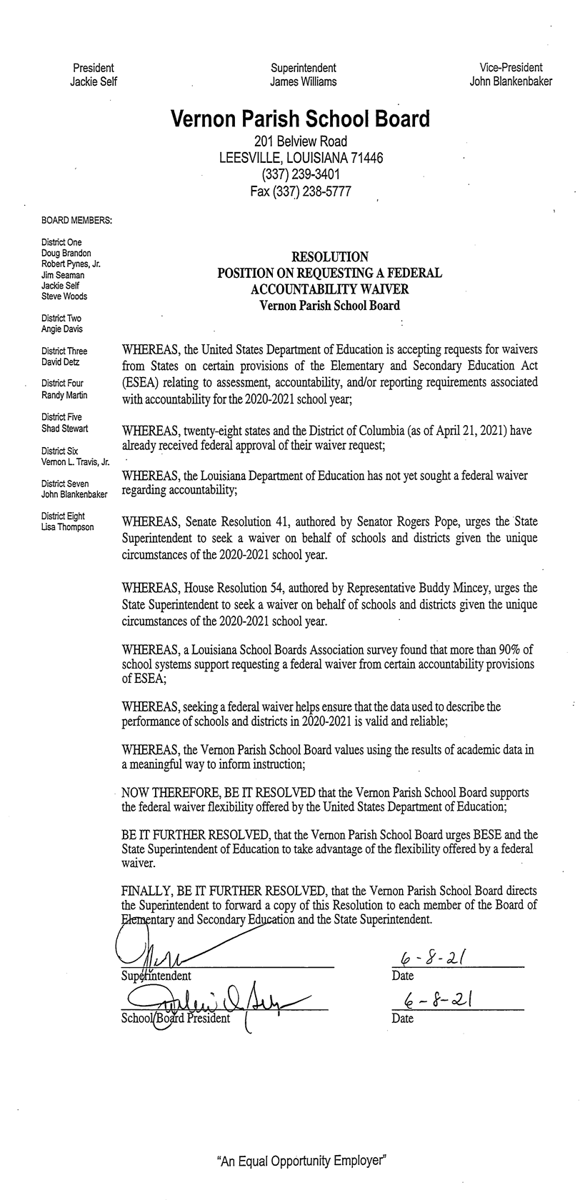 BE IT THEREFOR RESOLVED that the Vernon Parish School Board requests a copy of this memorial resolution be sent to his family at this time of sadness.
